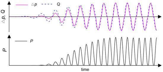 Inside the OWC chamber, the total volume of air and water is kept constant under the incompressible flow condition. Thus, the wave-induced oscillatory motion of the water column transforms into the change of the air volume inside the chamber, which in turn causes the airflow through the turbine at the top of the chamber. Therefore, over time, the airflow via the turbine becomes out of phase with the displacement of the free surface inside the chamber because the airflow is in phase with the oscillation speed of the free-surface inside the chamber. The typical time-series of the free-surface elevation (), differential pressure (), and the airflow rate () inside the chamber are shown in Figure 6a. It can be observed that the differential pressure and airflow rate have the same phase while the surface elevation inside the chamber and the pneumatic response show a phase difference of . These phase relations also demonstrated by Computational Fluid Dynamics (CFD) analysis in a previous study [].