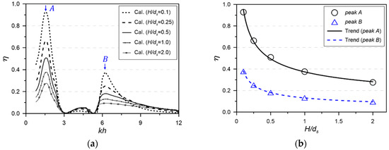The numerical calculations were performed to investigate the wave height dependency on the hydrodynamic performance of the OWC chamber model (Table 1 and Figure 4) under various wave heights and periods. The primary energy conversion efficiency () of the OWC chamber showed two notable peak responses depending on the incident wavelength (peak A: , ; peak B: , ) in Figure 12a. Here, is considered . The energy conversion efficiency of the peak A was relatively higher than peak B. As the incident wave height increases, the energy conversion efficiency at both peaks decreases nonlinearly and is more sensitive at lower wave heights, as shown in Figure 12b.
