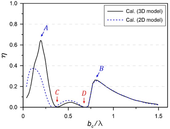 In real sea operation, OWC structures can be installed in the open sea or sheltered areas. Thus, the hydrodynamic performance of the OWC chamber is affected not only by the two-dimensional shape but also the three-dimensional effect, such as the structure breadth and sidewall. To investigate the three-dimensional effects on the hydrodynamic performance of the OWC chamber, additional numerical simulations were carried out for two- and three-dimensional chamber structure models. Figure 13 shows the comparison of the numerical results for both 2D and 3D models. In this case, the incident wave height was fixed as . As shown in the figure, while the second peak B is almost the same, the wavelength and efficiency at the first peak A change significantly due to the three-dimensional effect. For longer incident waves rather than the breadth of the chamber structure (), the distribution of the three-dimensional wave fields around the chamber structure influences the hydrodynamic performance of the OWC chamber.