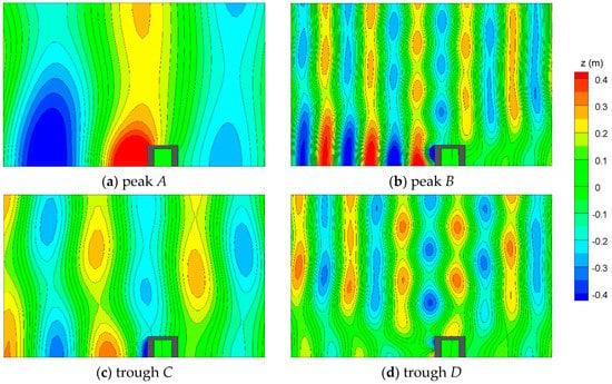 Wave field around an inclined OWC chamber in 3D simulations under regular wave conditions of (a) peak A, (b) peak B and (c) trough C, (d) trough D in Figure 13 (time step ).