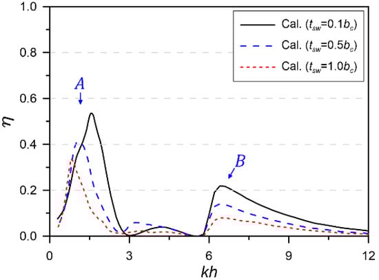 Figure 15 shows the comparison of the numerical results for the 3D model of the OWC chamber with various sidewall thicknesses (). The performance under the condition of peak B is almost the same because there is no three-dimensional effect due to the sidewall thickness. On the other hand, the incident wavelength corresponding to peak A was changed according to the sidewall thickness. The performance of peak A occurred when the standing wave developed to the maximum in front of the structure (Figure 16). As the sidewall gets thicker, the wavelength of peak A becomes longer and the energy conversion efficiency increases. This is because the sidewall thickness corresponds to the capturing width of the wave energy, which contributes to increasing the wave energy concentrated in the chamber.