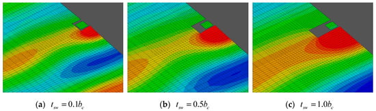 Wave field around an inclined OWC chamber for various sidewall thicknesses under regular wave condition of peak A. (time step ).