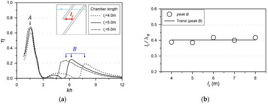 On the other hand, peak B, the peak performance of the sloshing motion, was dependent on the change in the chamber length. The incident wavelength corresponding to peak B () has a linear relation with the chamber length, , as shown in Figure 17b.