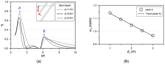 (a) Primary energy conversion efficiency of OWC chamber for various skirt draft (); (b) wave frequency under condition of peak A depending on skirt draft.