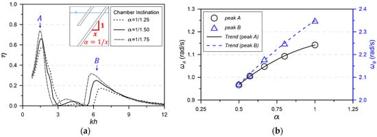 The inclination of the chamber structure () affects the direction of the OWC’s motion and restoration. According to Equation (15), as the inclination becomes mild (= decrease in ), the natural frequency of the water column shifts to a low-frequency side due to the decrease of the restoring force acting on the direction of the OWC’s motion. Both wave frequencies of peaks A and B showed a tendency to shift with the change of the chamber inclination, as shown in Figure 19a,b. Peak B of the sloshing motion’s wave frequency is also more sensitive to the inclination change than peak A, corresponding to the OWC’s piston motion in Figure 19b.