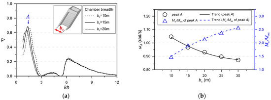 The chamber breadth is not included explicitly in the natural frequency of the OWC’s piston motion in Equation (15), because of the SDOF system was idealized in two dimensions. However, the planar geometry of the chamber structure certainly affects the added mass acting on the water column (see Figure 21). The wave frequency of peak A tends to shift toward the lower frequency as the chamber breadth () increases, as shown in Figure 21a.