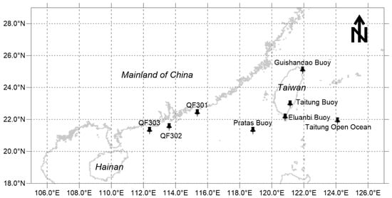 An open source of buoy wave data, released by the Central Weather Bureau of Taiwan (CWBT), is adopted to validate the model. More detailed information about the buoys can be accessed through the website: http://www.cwb.gov.tw/ (access date: July 2017). Another set of buoy data is from three buoys moored in the northern South China Sea (SCS), as seen in Figure 1. All three buoys are moored in open ocean, where the water depth is approximately 30–50 m. The buoys are 50–85 km from the coastline. Wave heights and wave periods will be verified in accordance with the data from these buoys.