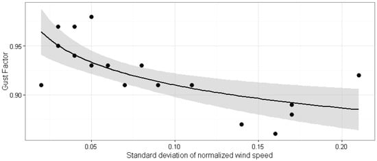 We accomplish this conversion with the following sequence of steps. First, we find out the maximum wind speed and its occurrence time from a track data file. Second, we utilize this maximum wind speed to normalize 48-h wind speeds before the maximum wind hour and get the standard deviation of the normalized wind speed. Thirdly, the gust factors can be estimated based on the standard deviations of normalized wind speed following Equation (13), where gf is the gust factor and std is the standard deviation of the normalized wind speed in the 48 h before the wind peak. A gust factor curve is fitted as in Figure 2. According to Figure 2, the gust factor decreases while the standard deviation increases, meaning that a sharply fluctuating typhoon should be reduced in a larger proportion. A detailed discussion of Equation (13) is presented in Section 5.1.