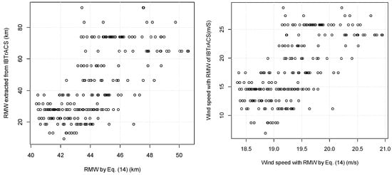 Comparison of the radius of maximum winds (RMW) by Equation (14) against RMW from IBTrACS (left) and comparison of wind speed deduced from the two RMWs (right).