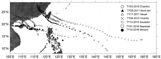 Tracks of seven representative typhoons in the Northwest Pacific.