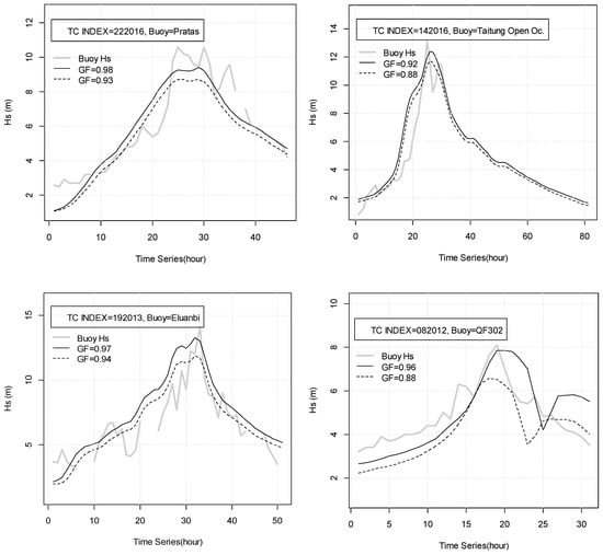 Figure 5 presents several other cases where the two gust factors are different. Statistics of their difference show that the wave height biases between buoy peak and modeling peak vary between 0.5 and 1.4 m, with the gust factor difference varying between 0.03 and 0.08. For a sharply turbulent typhoon wave series, this magnitude of peak wave difference may be negligible considering that the error ratio of all cases is about 10%, as in Table 3 (TC is the abbreviation of tropical cyclones).
