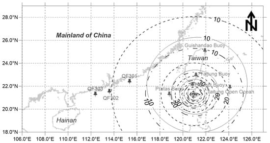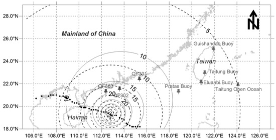 Another example is typhoon 172011 (Nesat). During this typhoon, three buoys QF301–QF303 worked well; their track is depicted in Figure 10, where the wind structure at the peak wave time is plotted. With this asymmetric wind field, higher wind speed is formulated in the right half of the typhoon track than in the left half, leading to an appropriate simulation of all three buoys in Figure 11 (QF301 and QF303) and Figure A3 (QF302). Though it is hypothetically triggered by the typhoon motion only, the asymmetric structure is indeed helpful to improve the accuracy of reconstructing the wind field.