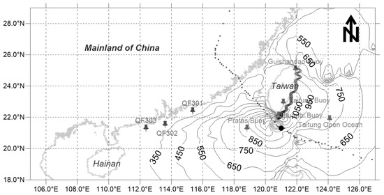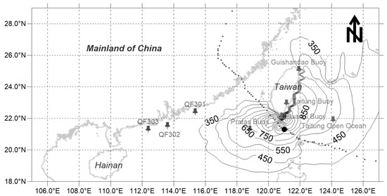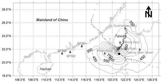 Geographical location of wave buoys for model verification (QF301–QF303 are from some discontinuous scientific projects; others are from the Central Weather Bureau of Taiwan (CWBT)
