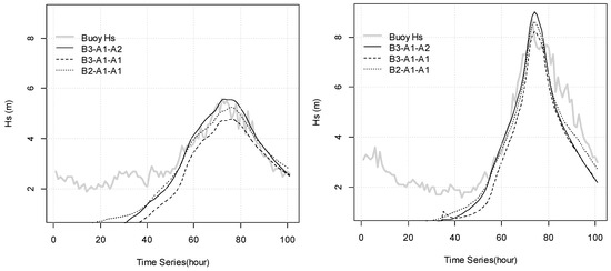 In Table 3, the mean error percentage of B3-A1-A1 when the asymmetric typhoon structure is excluded is 16%, and the error of B3-A1-A2 when the asymmetric structure is included is 10%. The model verification has shown that the introduction of the empirical asymmetric structure is helpful to enable the model to capture wave extremes. Similar conclusions can be visually drawn from the figures in Appendix A.