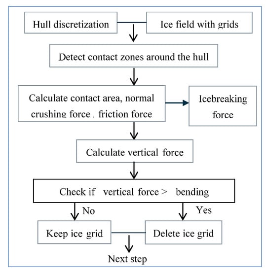 The loop of calculating the icebreaking force in the time domain is presented in Figure 2. The ice submersion force occurs when the broken ice floe fragmented from intact ice pile around the hull underwater. When a ship moves forward against the ice, the ice breaks at the bow area and the broken ice floe becomes submerged and slides along the hull. There were almost no ice floes sliding at the bottom of the ship model, and most of the ice floes moved laterally beneath the bordering ice sheet at the low drift speed range []. Based on the ice resistance formula described by Lindqvist [], the speed dependence of ice submersion resistance due to the loss of potential energy of the submerged ice floes and friction between the hull and ice floes was written as