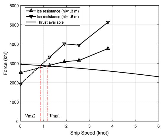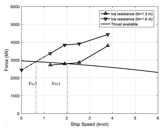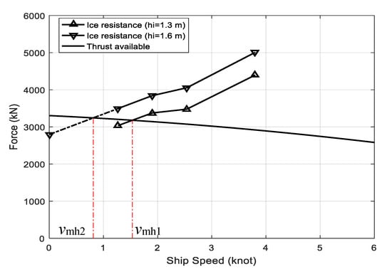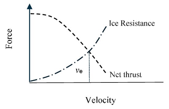 Figure 3 shows two typical curves of ice resistance and net thrust as a factor of ship speed with a certain ice thickness. The intersection of the two curves was taken as the expected steady speed ve of the ship. By changing the ice thickness, the h–v curve could be calculated.