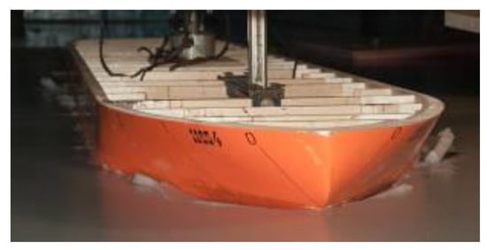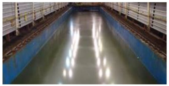 The model tests were carried out in the ice basin of the Krylov State Research Center (KSRC). The length of the tank is 45 m including the trimming area (as shown in Figure 4). The width and depth are 6 and 1.75 m respectively. The refrigeration system ensures uniform cooling of air over the tank down to −29 °C. The towing carriage could move by the rails running along both sides of the tank at a speed of 0.0005~1 m/s. This carriage possesses a number of openings serving to spray sea water uniformly over the test tank to generate the model ice. Usually, it takes two days to generate an ice sheet. The ice thickness ranges from 10 to 80 mm with an error less than ±1.5 mm. The bending strength of the model ice is 10~70 kPa with relative error of no more than ±20%.