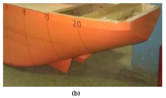 Photographs of the ship model. (a) Bow view (b) Stern view.