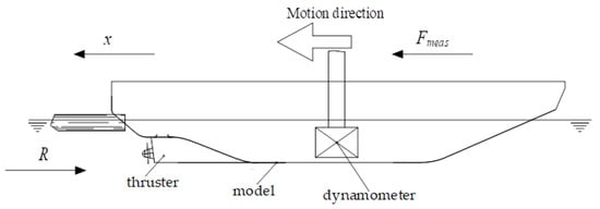 The ship model was constrained to the carriage, then the force could be measured. A dynamometer was installed and applied to measure the ice force acting on the model ship. The general setups of the model tests are shown in Figure 6.
