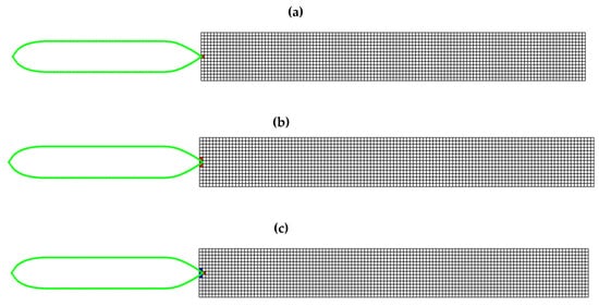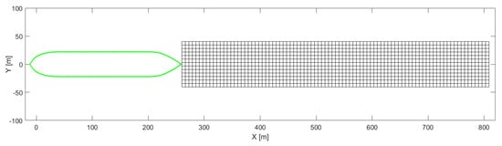 The ice field was composed of squared ice grids with the same size. The length of each ice grid was set to be the breaking length. The initial positions of the ship and ice field are shown in Figure 8.