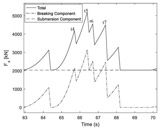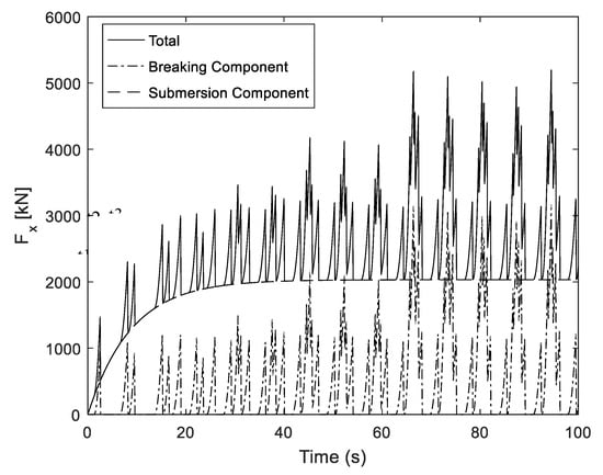 Test 11 was simulated using an ice drift velocity of 1.27 kn and ice thickness of 1.3 m. The speed-dependent icebreaking length coefficient Cl was selected to be 0.24 while the bending capacity coefficient Cf was set to be 2.5. The longitudinal ice force exposed to the ship was of interest for analysis of both operation modes herein. Therefore, only the longitudinal ice force was considered and taken as the ice force for short. The time series of the ice force components due to breaking and submersion are given in Figure 9. It can be seen that the ice submersion force increases steadily to a constant value. The breaking component is nonlinear and changing rapidly, significantly depending on the failure of the ice grid around the waterline of the hull.