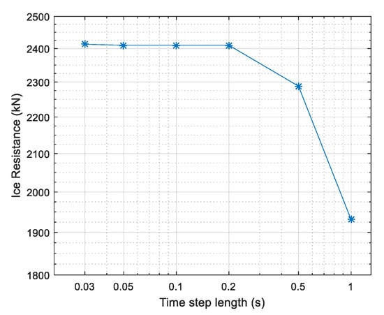 The specified ice thickness was 1.3 m and the speed was 1.27 kn (as same as that used in Test 11). Different values of time step lengths (0.03, 0.05, 0.1, 0.2, 0.5, 1 s) were applied. The ice resistance encountered by the ship as a function of time interval is plotted in Figure 13. As shown in Figure 13, the simulated ice load converges quite well when the time step length decreases. It comes to be steady at around 2400 kN when the time step drops to 0.2s. The computation time versus time step length is also given in Figure 14. From Figure 14, it is clear that the computation time increases exponentially with decreasing time interval. Considering the balance between computation time and the accuracy of the numerical simulation, the time step length of 0.1 s was appropriate and used in the following simulations.