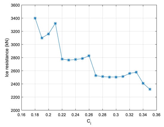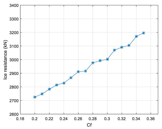 In addition, effects of speed-dependent icebreaking length coefficient Cl and bending capacity coefficient Cf were studied. In total, 18 icebreaking length coefficients ranging from 0.18 to 0.35 were considered in the simulation. The corresponding results are presented in Figure 15. It is shown in Figure 15 that as the icebreaking parameter Cl increases, the ice resistance decreases monotonously. Increasing Cl means large ice floe broken from intact ice sheet and long distance of travelling is needed before consequent collision. The impact of bending capacity coefficient Cf on ice resistance is given in Figure 16. It shows that the ice resistance increases as Cf increases in general. The relationship is almost linear. The ice resistance rises from 2730 kN to 3200 kN when the bending capacity coefficient increases from 0.20 to 0.35.