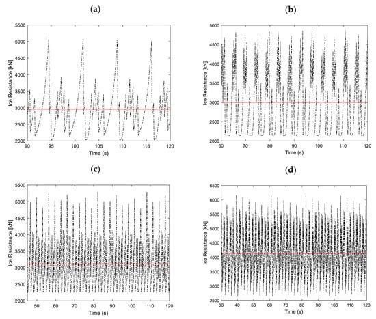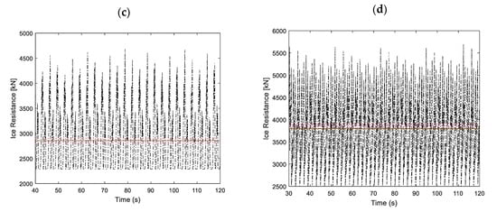 The astern running tests were included with the input parameters shown in Table 2 and Table 3 as well. Eight tests were simulated in ice sheets with thicknesses of 1.3 and 1.6 m with different towing speeds of the hull. The time series of the ice force at the steady state are shown in Figure 20 for Tests 15~18 and Figure 21 for Tests 25~28. The simulated and measured ice resistances are compared in Figure 22.