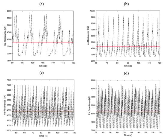 The general ice data with respects to bending strength, crushing strength, elastic modulus, water and ice density, ice-hull friction coefficient, Poisson ratio and gravity acceleration are given in Table 3. The bending strength, crushing strength, elastic modulus and ice-hull friction coefficient were measured directly from the model test. The unknown parameters were Poisson ratio, and water and ice density. The Poisson ratio was selected based on previous study [,]. The water contains many chemical components including salts. Herein, the density was taken as sea water density with 1025 kg.m−3. The ice density varies from 720 to 940 kg.m−3 with an average of 910 kg.m−3 []. The ice density was taken as 900 kg.m−3 in the present study. All data shown in the present paper are in full scale if not specified otherwise.