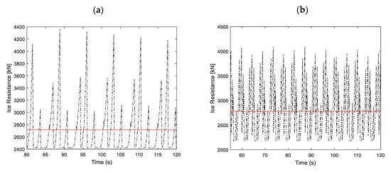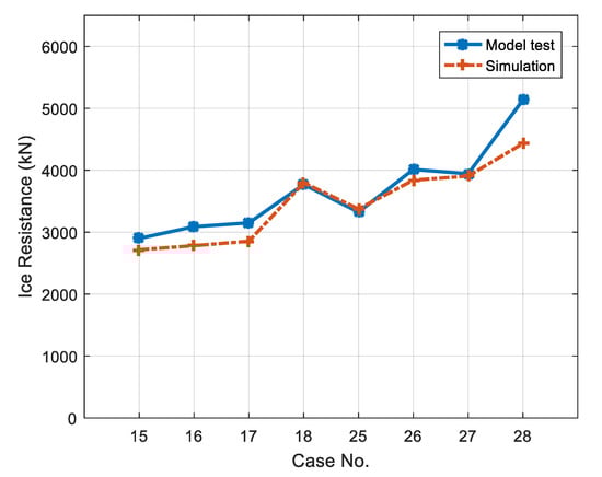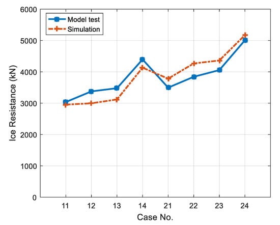 The ice force was averaged as ice resistance. The ice resistances derived from numerical simulation as well as model test were compared herein and are presented in Figure 19. It is indicated that the general trend of two curves agree well with each other. The ice resistance curves go up as the towing speed increases. The relative errors between the calculated and measured ice resistance values are discussed in a subsequent section.