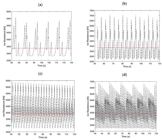 Time series of the ice forces during the ahead running operation in ice sheet with a thickness of 1.3 m. (a) Test 11 (b) Test 12. (c) Test 13 (d) Test 14.