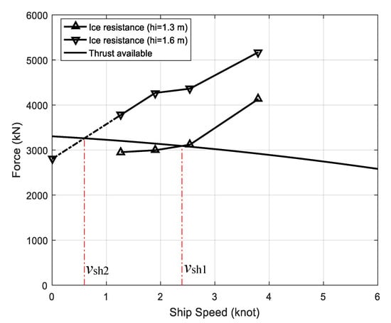As described above, the static method is based on the static balance of the ice resistance and thrust delivered by propellers. The bollard for the heading forward operation is 3305 kN and the open water speed of the ship could reach up to 16 kn. The thrust curve as a function of ship speed is calculated according to Equation (3) and presented in Figure 23. The simulated ice resistances are also plotted in Figure 23 for all the ahead running tests. For the curve composed of tests with an ice thickness of 1.3 m, the ice resistance counteracts 3261 kN thrust. The ship speed vsh1 at balance is 2.39 kn. For the curve of the tests with an ice thickness of 1.6m, there is no intersection with the thrust curve. The ice resistance has to be extrapolated as a dashed line in Figure 23. The corresponding speed vsh2 is 0.59 kn at the intersection.