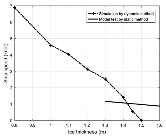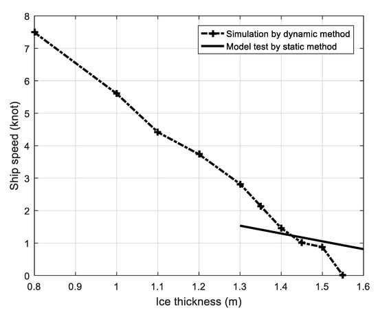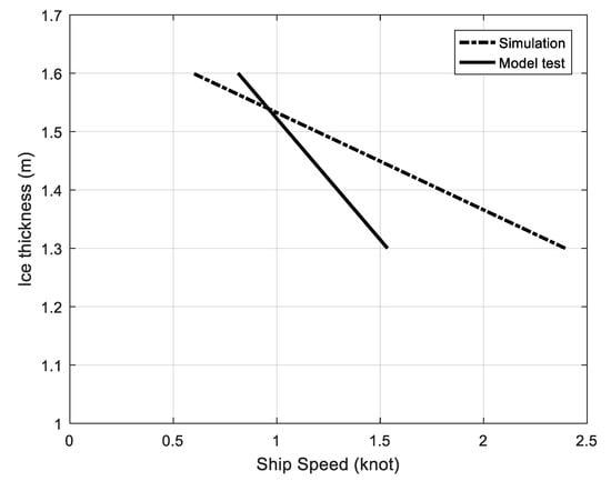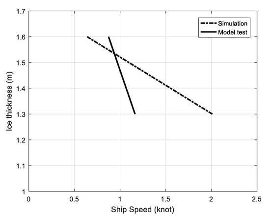 The attainable speeds of the ship were collected based on Figure 29. Then, h–v curves from the dynamic simulation and the model test are compared and given in Figure 30. The results show that the icebreaking capability of the ship is 1.45 m at a speed of 1 kn by using the dynamic analysis method. The simulated result is slightly lower than the model test result at 1.52.