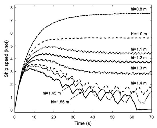 Simulated time series of the dynamic ship speed in the ice sheets with different thicknesses for ahead running.