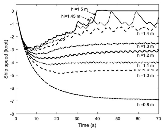 For ahead running, there are eight ice thicknesses ranging from 0.8 to 1.55 m considered in the simulation. The simulation stops when the ship speed becomes relatively stable. The simulated time series of ship speeds under different ice thicknesses are shown in Figure 29. The ship starts to accelerate under maximum thrust and zero ice resistance at the beginning. Then, the thrust decreases and the ice resistance increases eventually as the ship speed increases. If the ice resistance is lower than the ice resistance before reaching the maximum speed, the ship speed will increase to a steady value in ice thicknesses of 0.8 m and 1.0, as shown in Figure 29. If the ice resistance is larger than the thrust when the speed reaches the peak, the ship speed will drop afterwards and come to a relatively steady value under ice thicknesses of 1.1, 1.2, 1.3, 1.4, 1.45, and 1.55 m. For the simulation in 1.55 m ice, the ship comes to stop completely and gets stuck in ice because the maximum thrust is not enough to overcome the ice resistance. As the ice thickness increases, the ship tends to vibrate severely. The amplitude of the speed vibration could be up to 0.17 m/s for the test in 1.5 m ice.