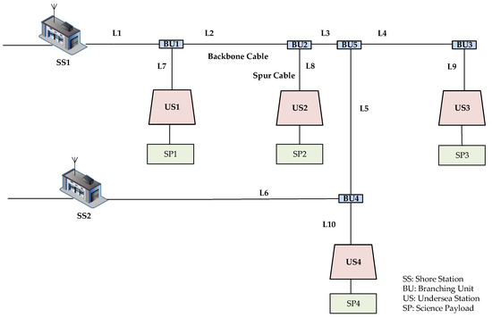 Figure 2 shows a CSO with a chained structure with one power supply, a shore-based station connected with one backbone cable, and the undersea stations that have no redundant power transmission line. Typical representatives are MARS (Monterey Accelerated Research System) [18,23], OOI (Ocean Observatory Initiative) [17], VRNUS (Victoria Experimental Network Under the Sea) [24], and East China Sea Experimental Seafloor Observatory [25].