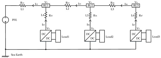 The spur cables are short in length and fixed in position. Their depths and temperatures can be gained through the sensors in the nearest undersea stations, so that the resistances can be calculated through Equation (1) and (2). The voltage of a branch node can be calculated by the spur cable resistance and the input voltage and current of the undersea station. Figure 2 shows a CSO with one shore station and three undersea stations. L1–L3 are the backbone cables, and L4–L6 are the spur cables. The voltage of BU1 can be calculated by the function:
