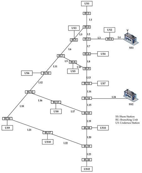 Figure 9 shows a schematic diagram of a meshed structure, which is a simplified topology of the NEPTUNE project in the early stage [5,21,22]. This meshed structure consists of two shore stations, 12 undersea stations and 20 BUs. The length of each backbone cable is 100 km and the length of each spur cable is 10 km. The output voltage of each shore station is 10 kV, and the load of each underwater station is 1 kW.