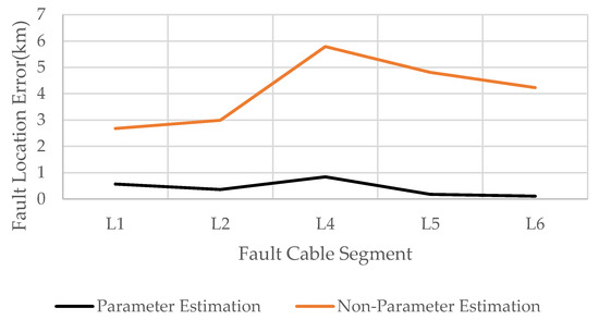 In the prototype, the resistance errors of the cable prototypes are set to be about 1%, to simulate the influence of seawater temperature variations on the submarine cable resistances. Parameter estimation is a process of estimating unknown parameters in a population distribution from random samples taken from the population. In this paper, the cable resistance is taken as an unknown parameter, and estimated according to the measured voltage and current values. The fault location results, with or without parameter estimation, are compared, as shown in Figure 11. It can be seen that, when the step of parameter estimation is carried out, the fault positioning accuracy will be higher, and the positioning error is less than 1 km. Otherwise, the fault location error will be larger.