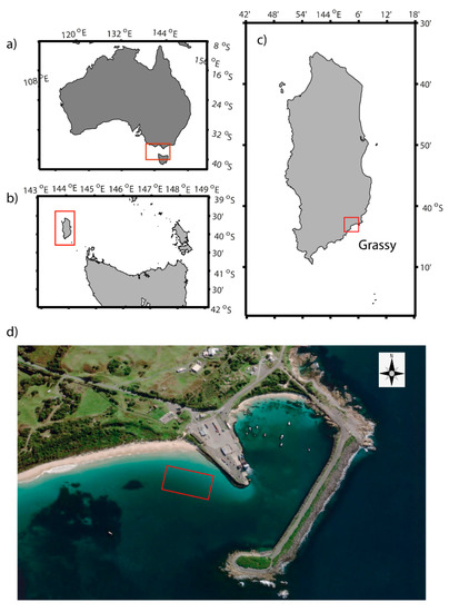 (a) National map of Australia. (b) Regional scale of Northern Tasmania with the Furneaux Islands Group in the east and King Island in the west. (c) Local map of Tasmania with the location of Grassy on the southeast coastline. (d) Location and zoomed in satellite image of Grassy Harbour. The survey area is outlined by the red square near the rock wall of Grassy Harbour.