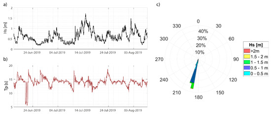 The sea state at the site has been continuously measured (since 14 March 2019) with RBR pressure sondes, and since June 2019 with a Nortek acoustic wave current profiler (AWAC) profiler placed approximately in the center of the target area (Figure 1e). A representative time series of significant wave height Hs and peak period Tp observed between 16 June 2019 and 08 August 2019, as well as a wave rose, are depicted in Figure 2a–c, respectively.