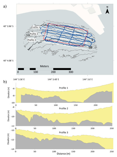 An accurate high-resolution map of the top 2–4 m of sediment was constructed from the SBP data with the profiling frequency of 10 kHz. At the proposed installation location (and in vicinity thereof), no boulder and reef formations were found and the sub-bottom profiling revealed relatively homogeneous surface substrate. Confirming the core data, the entire survey area revealed more than 1000 mm of sand layer thickness, with areas identified with a minimum of 2000 mm cover in 5 m of water for placement of the structure. Individual sub-bottom data of three shore-parallel transects are shown in Figure 4a whilst cross section profiles of sand coverage and underlying bedrock are depicted in Figure 4b. These profiles were created by visualizing a vertical slice representation of the seabed and the underlying second return associated with the bedrock boundary. The bedrock layer typically slopes downwards to the east, with the exception of Profile 1, where the underlying reef/rock approaches the surface near the tip of the rock wall and adjacent ferry terminal. On the western side, the reef/rock begins to approach the surface; however, this is outside of the survey area and nearing a subsurface reef/rock exposure on the seabed 75 m to the east of the survey area (see also the satellite image, Figure 1e).
