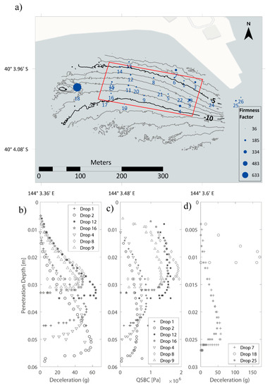 The smaller the penetration, the harder the substrate and the larger the FF values (and QSBC values). Thus, profiles with peaks around 0.02 and 0.03 m represent compacted sediments while the larger penetration depths suggest a softer substrate or looser compacted material. Despite these minor differences, all penetrometer casts exhibit characteristic deceleration curves for noncohesive sediments (Figure 5b). Likewise, the penetration depths range between 0.01 and 0.06 cm, which is typical in coastal areas dominated by sand [11,18,21]. Generally, the FF ranges between 50 and 120 with an average value of around FF = 80 (when drops on rock outside of the survey area are excluded). These values correspond to QSBC estimates of up to 2 MPa (Figure 5c), indicative of the sandy substrate found throughout the target area [11,18]. Figure 5d depicts deceleration profiles taken outside of the target area. The penetration depths are much smaller compared to casts obtained inside the candidate site, especially drop 18 that was carried out over a rocky submarine outcrop, peaking at 170 g with a penetration depth of ~10 mm.
