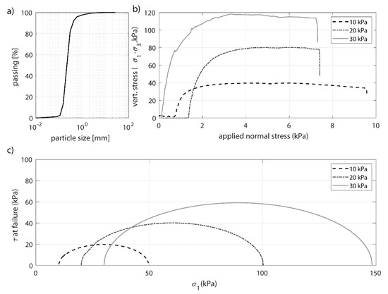 In total, three samples from AWAC site (center), Site 2 (center) and Site 3 (west) were tested under the same conditions of saturation and cell or radial pressure. The results obtained from the OWC center location are shown in Figure 6b,c. The shear or deviatoric stress q = (σ1–σ3) is plotted against the vertical stress for the three applied loads (Figure 6a). Figure 6 shows first a linear increase of shear strength which is followed by a nonlinear section until failure is reached. This shear vs. stress relation shows a shear failure relation which is characteristic for a dense sand. Softening, indicating that the shear strength decreases with further deformation, is evident after the point of failure. Table 2 summarizes the stress conditions at failure for loads. Figure 6c shows the corresponding Mohr circles of the triaxial tests. A yield surface without cohesion is evident and the friction angle is determined to be ~φ = 41.75°.