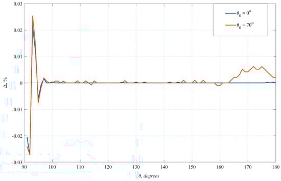 We estimate the accuracy of the MDOM based on a comparison with the exact analytical solution of S. Chandrasekhar [] for the radiance of reflected radiation from a semi-infinite medium with a Rayleigh scattering phase function. We take the functions necessary for calculating the exact solution from the tables []. The relative error of the MDOM relative to the exact analytical solution Δ for a medium with Λ = 0.999 and two incidence angles ϑ0 = 0° and 70° for different sight angles is shown in Figure 1. The observation scheme is adopted, in which the direction to the Nadir ϑ = 180°. As one can see, the error does not exceed 10−5 in almost the entire range of sight angles.