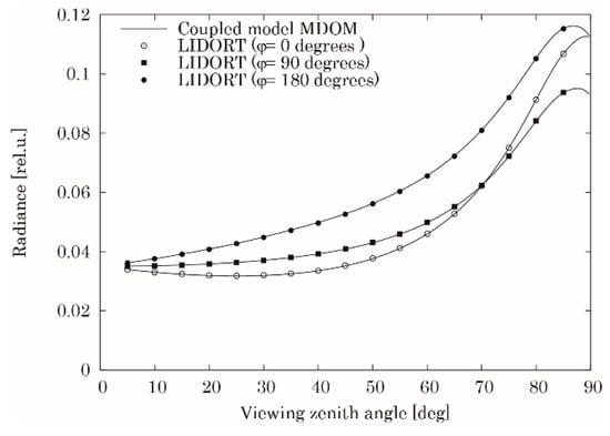 The coupled model MDOM has been compared with the coupled code LIDORT []. The results of the comparison are shown in Figure 2. The agreement up to the 6th digit has been obtained. The computations have been performed for the coupled model with the flat oceanic surface. The ocean has been modeled as a two-layer system with the dissolved organic matter in the upper oceanic layer. The atmosphere was modeled as a 14-layer system containing the trace gases (O3, NO2) as well as the urban aerosol.