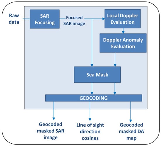 The block diagram that describes the overall processing chain is shown in Figure 1. More specifically, starting from raw data and after the SAR focusing operation, the corresponding Doppler Centroid frequency, referred to in the following as , is estimated over small sliding patches: details on the patch sized choice are provided in Section 7. Subsequently, the DCA, referred to as , is extracted by subtracting the Doppler centroid induced by the antenna pointing and Earth rotation. The DCA and the radial velocity of the backscattering cells are related by the following simple equation: