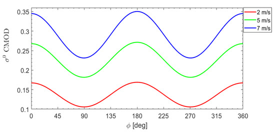computed with CMOD-IFREMER, see Equation (15), as a function of wind speed and direction, for 23° of incidence angle. Results for three different wind speed values are shown: 7 m/s (blue line), 5 m/s (green line), 2 m/s (red line). indicates a wind blowing towards the antenna.