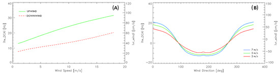 Plots relevant to the Doppler Geophysical Mapping Function describing the Doppler Centroid Anomaly (DCA) in Equations (18)–(22) as a function of the wind speed and direction. (A) modulus of the DCA () as a function of wind speed, for 23° of incidence angle and for VV polarization: upwind condition in green, downwind condition in red dashed. (B) DCA ( ) as a function of the wind direction, same incidence angle polarization as in the left image, for three different wind speed values: 7 m/s (blue line), 5 m/s (green line), 2 m/s (red line).