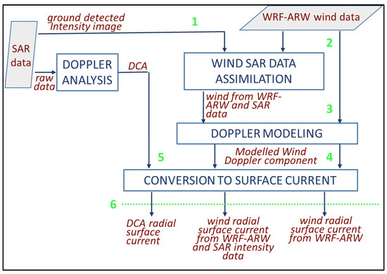 Data analysis scheme explaining the procedure followed for the joint analysis on the Doppler (surface current) derived by the SAR data (complex and detected intensity) and the atmospheric model.